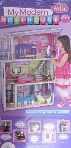 My Modern Dollhouse is a 2011 KidKraft production. CONTENTS: Composite Wood Dollhouse with Lights & Sounds is approx. 36.6" long x 47.2" high x 14" wide, & 13 Pieces of Furniture. FEATURES: The Lamp Lights Up, the Keyboard plays Music, the Toilet makes Flushing Sounds, the Window Shutters Open & Close, & the Elevator Glides. The Doll House is intended for Barbie & other 11.5" fashion size & type dolls: NO DOLLS included. All the provided details are to the best of my ability & may not be exact; colors, styles, sizes & details may vary. For ages 3+ Years. For Box Condition see CONDITION NOTE or Email Seller for Details. *Doll House is Composite WOOD, & it is MORE SOLID than Plastic Houses, & HEAVY for shipping purposes!